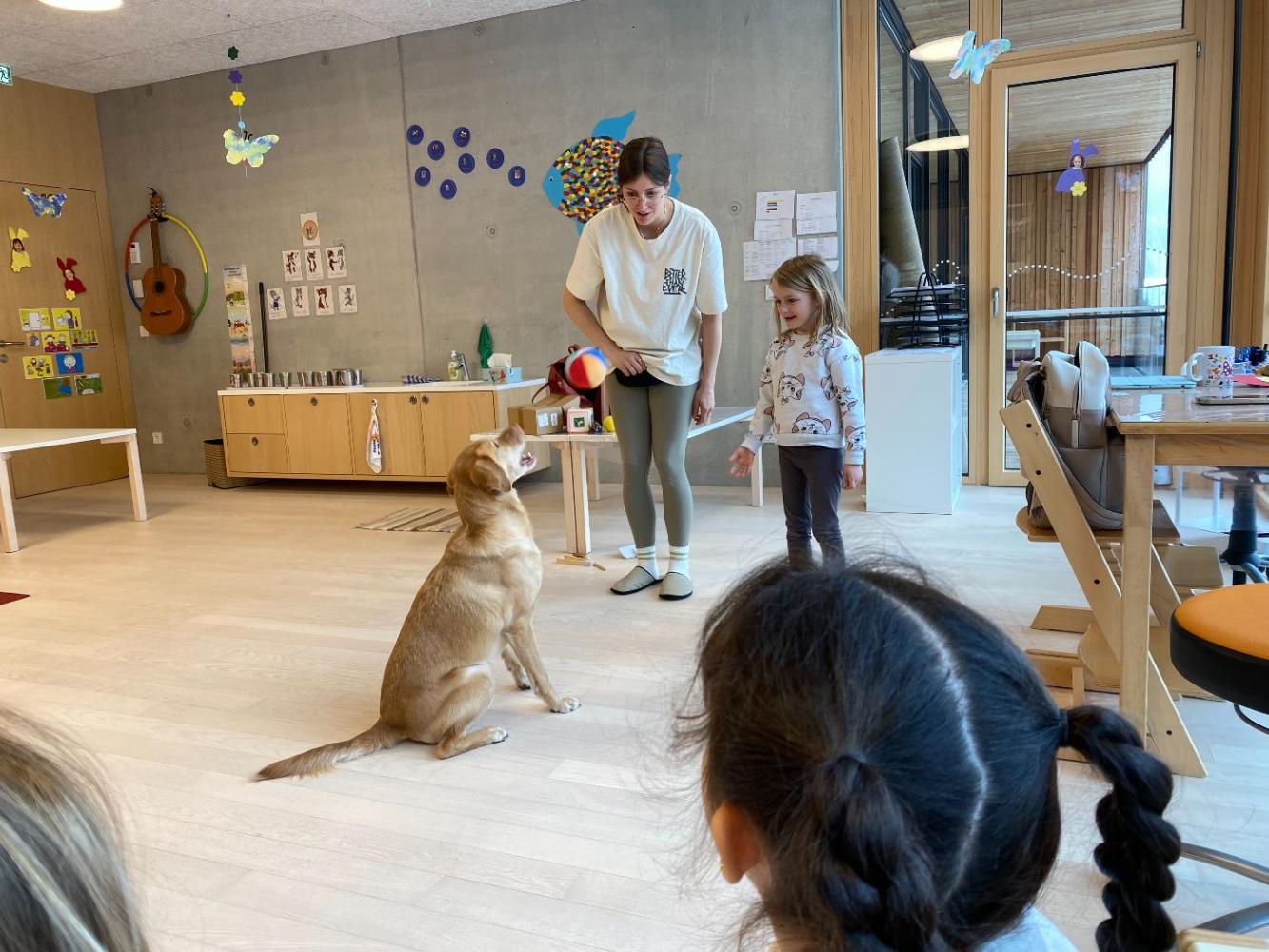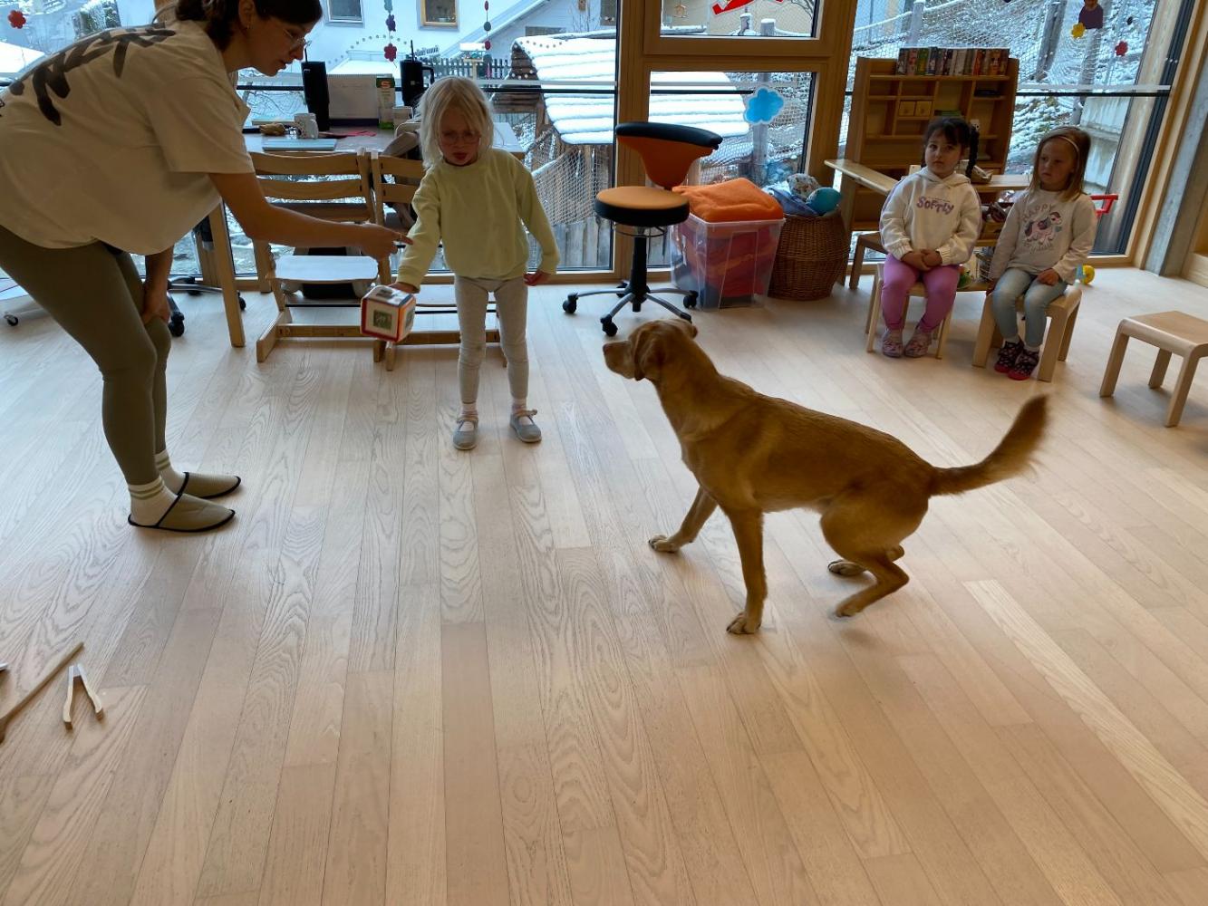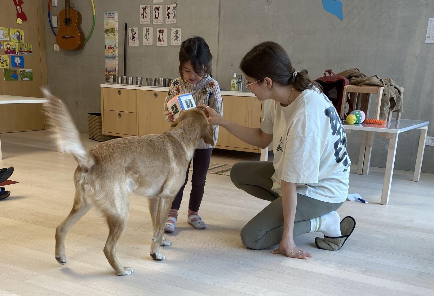 Neben den theoretischen Inhalten kommt auch der spielerische Teil nicht zu kurz: Gemeinsam mit Samu wurde Ball gespielt und gewürfelt. Die Kinder durften ihn bürsten und streicheln, wodurch Vertrauen aufgebaut wurde. Besonders viel Freude bereitete das Versteckspiel mit Leckerlis, bei dem Samu seine feine Nase einsetzen konnte.